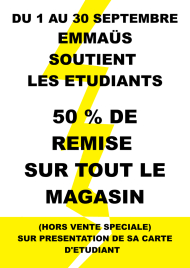 Alors que la précarisation frappe chaque année les jeunes de plein fouet, Emmaüs Saint-Agnant soutient les étudiants en leur proposant une vente solidaire dès la rentrée. Du 1er au 30 septembre, ils pourront venir s’équiper à des prix réduits dans nos magasins. Cette offre est valable sur tous nos stands (hors vente spéciale) sur présentation d'une carte d'étudiant et d'une pièce d'identité. Déduction en caisse.